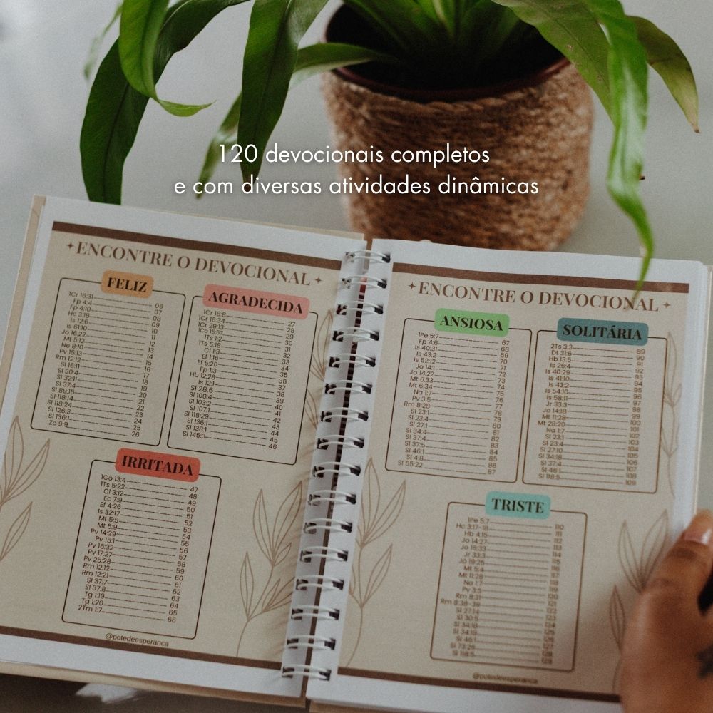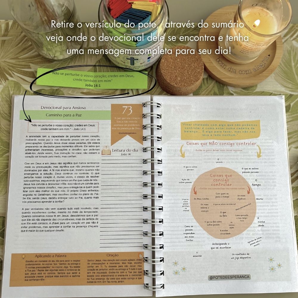 Para tornar essa experiência ainda mais profunda, oDevocional do Pote de Esperançaconecta cada versículo a um estudo prático e organizado. Separados por emoções específicas (como alegria, tristeza, gratidão e muitas outras), os devocionais ajudam você a viver a Palavra de forma direcionada, transformando seu tempo com Deus em um momento de encontro, reflexão e transformação.