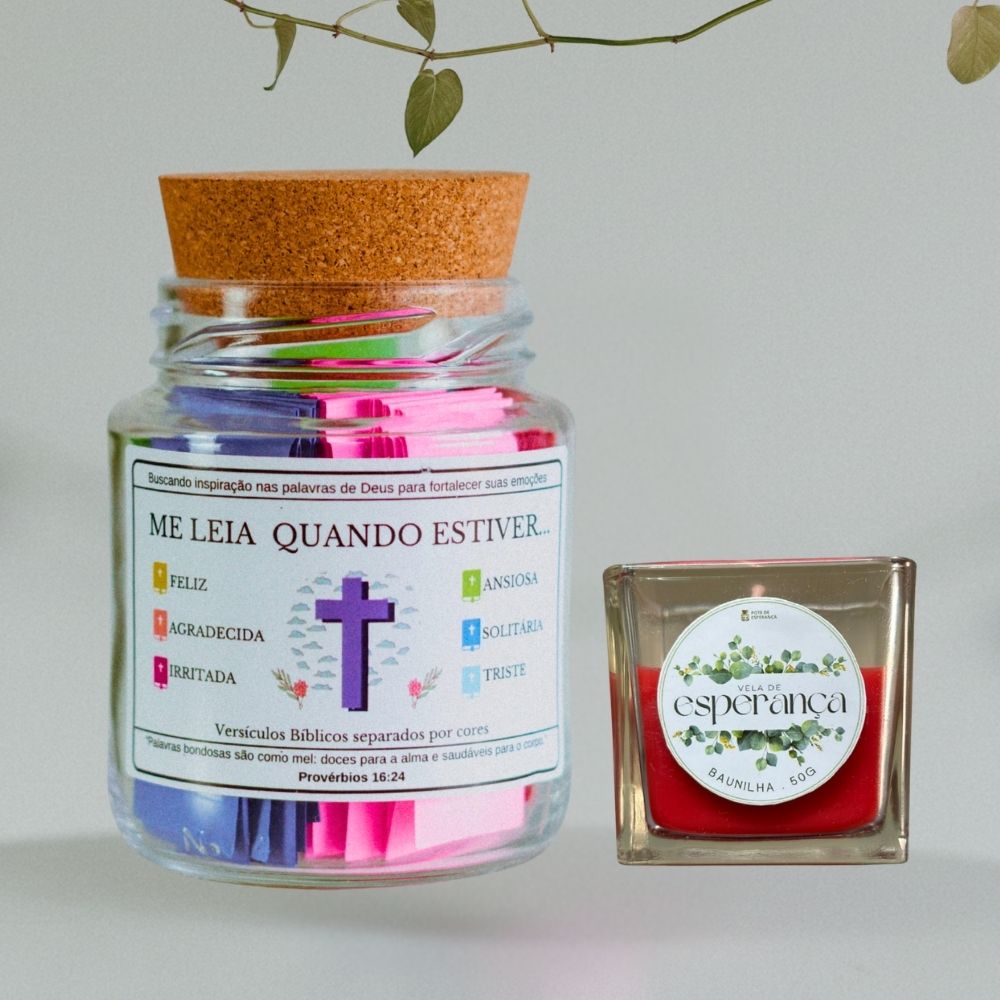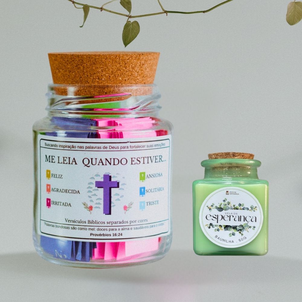 O Kit Esperança foi criado para quem deseja viver — e presentear — momentos de fé profunda e renovação interior. Cada item carrega uma mensagem única: o Pote de Esperança inspira pela Palavra e a Vela de Esperança cria o ambiente ideal para se conectar com Deus.